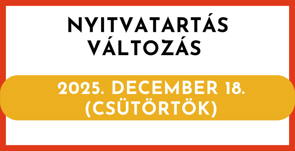 Könyvtárunk nyitvatartása 2025. december 18-án, az alábbiak szerint változik.