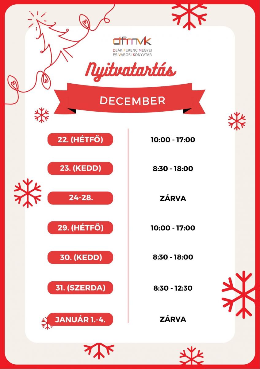 Könyvtárunk nyitvatartása az ünnepek alatt, az alábbiak szerint változik: